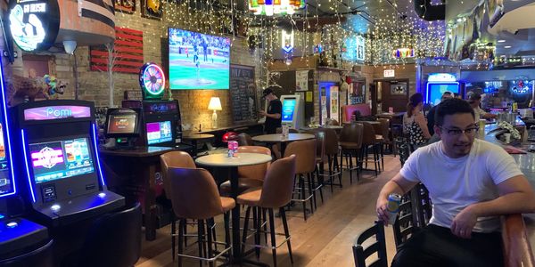 Babe's features a classic Chicago bar top, exposed brick & paneled walls, vintage chairs, red vinyl benches, low light, neon, stained glass, and a Golden Tee machine with its own fan club.